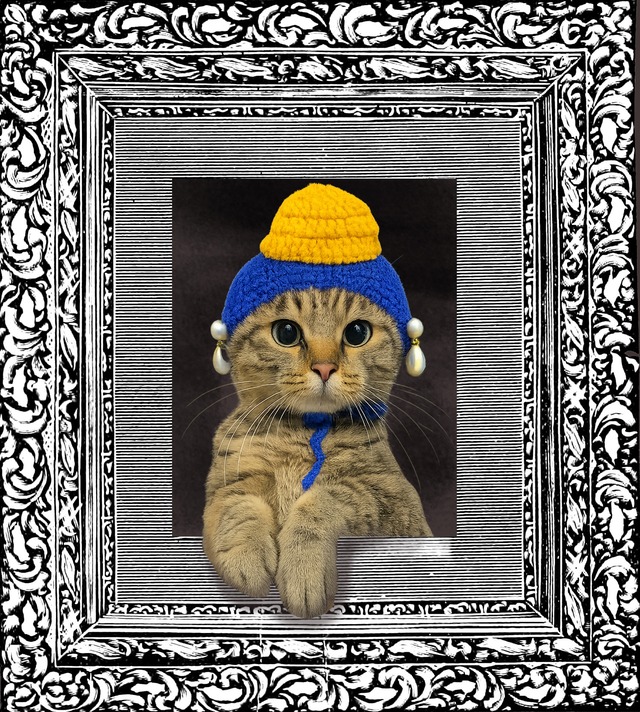 ーーー 学芸員による解説風 商品説明 ーーー こちらは、17世紀オランダ絵画の名作 フェルメール作《真珠の耳飾りの少女》へのオマージュとして制作された作品《真珠の耳飾りの猫》です。 まず注目していただきたいのは、正面を見据える猫のまなざしです。 無垢でありながら、どこか思索的。 原作が持つ「見る者と見られる者の関係性」を、 猫という存在に置き換えることで、現代的に再解釈しています。 柔らかな毛並みと光沢のある真珠との対比が、 静かな緊張感を画面にもたらしています。 額縁から前足がわずかに飛び出す構成も、 鑑賞者との距離を縮めるための意図的な演出です。 「絵画を鑑賞する」という行為そのものを、 ユーモラスに問い直す仕掛けと言えるでしょう。 本作は単なる装飾品ではなく、 鑑賞・対話・余白を楽しむための小さな展示作品です。 ご自宅に迎え入れていただくことで、 日常の中に、ささやかな“美術館の時間”が生まれます。 【サイズ】 写真でご確認ください。 キジトラ、黒猫ともに4kgの女の子です。 手作り品のため、寸法にバラツキが発生します。 表示されている寸法±1.5cmの誤差を考慮の上、余裕を持ったサイズを注文してください。 モニター設定、照明等により実際の商品と色味が異なる場合がございます。 【素材】 プラスチックビーズ アクリル毛糸 ※毛糸はロットや仕入れ先の変更により色や太さが変わることがあります。ご了承ください。 【安全上の注意】 この商品は写真を撮るためなど、一時的に使用するものです。 必ず飼い主の監視のもと、使用してください。 ペットが嫌がるときは絶対に無理してつけないでください。 【送料について】 この商品は2つまでクリックポスト(全国一律300円)可。 3つ以上はヤマト宅急便(全国一律1200円)を選んでください。 ギフトラッピングを希望の方は必ずヤマト宅急便(全国一律1200円)を選んでください。 【ギフトラッピングについて】 こちらをご覧ください。 https://shop.nekonote-company.com/items/68148216 ※こちらの商品は仕入れ品をもとにネコノテ堂で手加工したものです。 ----------------------------------------- ネコノテ堂 https://nekonote-company.com/ -----------------------------------------