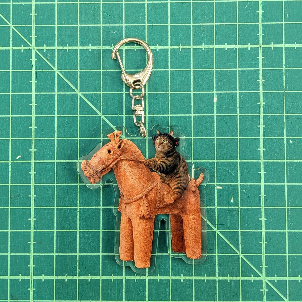 馬形埴輪にまたがるみずら猫のキーホルダーです。