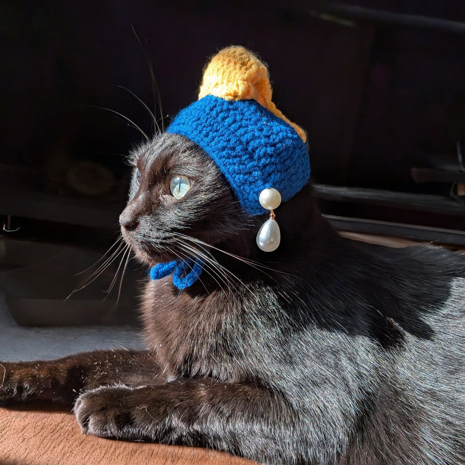 ペット用「真珠の耳飾りの猫」フェルメール 犬 猫 被り物 コスプレ 帽子 ぬい活 真珠の耳飾りの少女